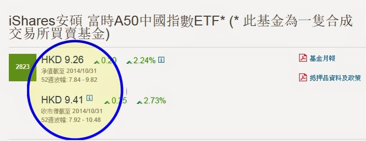 投資者還可循溢價高低判斷買入與否,溢價是指ETF價格與資產净值的差距。 從發行商的網站,可以看到X安碩A50(2823)10月31日收報9.41港元,同日淨值為9.26港元,代表溢價1.6%。